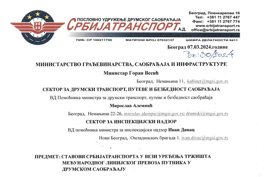 На састанку Одбора директора Пословног удружења друмског саобраћаја „Србијатранспорт“ Београд , који је одржан 06. марта 2024. године, у оквиру : тачке 6. Сагледавање постојећих чињеница и тржишних услова пословања превозника који обављају међународни друмски превоз путника; расправљано и констатовано да су велики проблеми превозника и тржишни услови пословања у јавном линијском међународном превозу путника и да је превазилажење проблема и унапређење регулативе неопходно реализовати што пре.