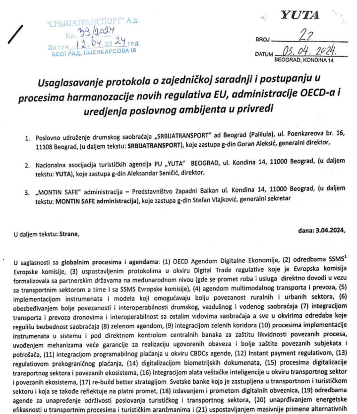 Srbijatransport je potpisala protokol sa Nacionalnom asocijacijom turističkih agencija YUTA i uz uključivanje Mon Tin Safe administracije preduzima konkretne aktivnosti na nacionalnom, regionalnom i evropskom nivou u cilju uređenja poslovnog ambijenta, podsticanja konkurentnosti i obezbeđivanja kvalitetnih rešenja za privredu, pristupa fondovima za finansiranje projekata u interesu sektora saobraćaja i transporta, prevazilaženje evidentiranih problema i obezbeđivanje EU projekata u cilju rešavanja problema mobilnosti i poslovanja na viši nivo uz implementaciju EU direktiva i usklađivanja zakonodavstva.
