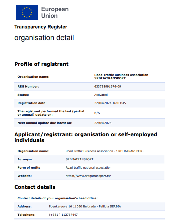 Poslovno udruženje Srbijatransport, predstavnika poslodavaca drumskog i železničkog prevoza Republike Srbije je od 22. aprila 2024. godine evidentirana na Registru transparentnosti Evropske komisije.