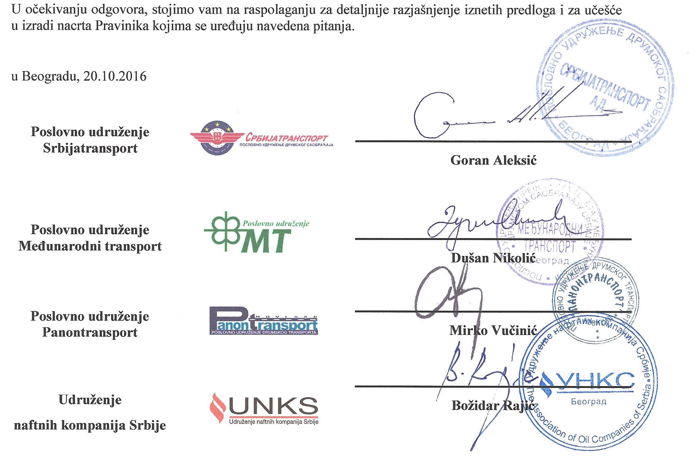 Poslovno udruženje drumskog saobraćaja "Srbijatransport" a.d. Beograd očekuje da će se podneta inicijativa razmotriti i analizirati svi detalji i činjenice sa aspekta stvaranja povoljnog poslovnog ambijenta, podsticanja konkurentnosti, suzbijanju sive ekonomije i podsticanja privrednog razvoja Republike Srbije.