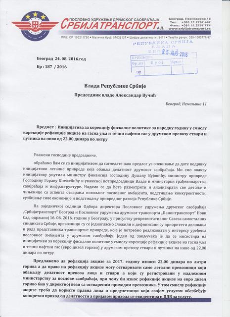 Poslovno udruženje drumskog saobraćaja "Srbijatransport" a.d. Beograd, obratilo se predsedniku Vlade Republike Srbije Aleksandru Vučiću sa inicijativom da se izvrši korekcija fiskalne politike u smislu korekcije refakcije akcize na gasna ulja i tečni naftni gas u drumskom prevozu stvari i putnika na nivo od 22 dinara po litri.