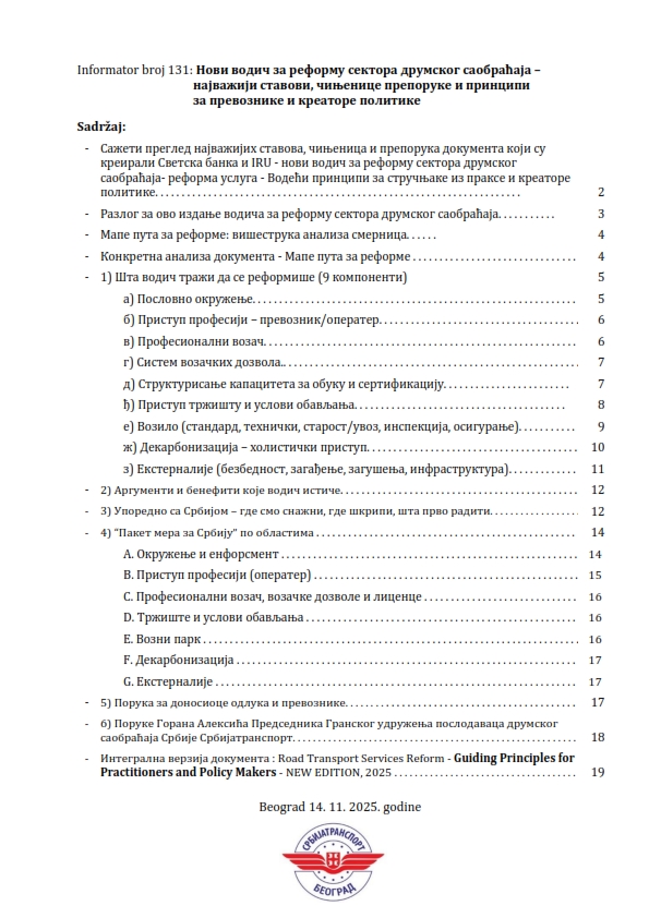 NOVI VODIČ ZA REFORMU SEKTORA DRUMSKOG SAOBRAĆAJA